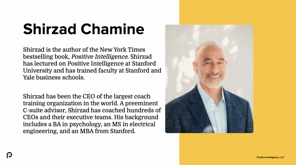 © 2025 Positive Intelligence, LLC. All rights reserved. POSITIVE INTELLIGENCE®, PQ®, CERTIFIED PQ COACH™, PQ COACH™ and P+ logo™ are trademarks of Positive Intelligence, LLC. No reproduction, alteration, translation, publication, or distribution, in any form, printed or electronic, is permitted without the express prior written consent of Positive Intelligence, LLC.©️ 2025 Positive Intelligence, LLC The coach identified herein is an independent member of the PQ Coach program, and not an employee, agent, or representative of Positive Intelligence, LLC. The coaching program offered herein is independently owned and operated by the coach, and is not affiliated with or endorsed or sponsored by Positive Intelligence, LLC.PROGRAM CONTENT AND MATERIAL DO NOT CONSTITUTE MEDICAL OR MENTAL HEALTH ADVICE AND ARE NOT A SUBSTITUTE FOR PROFESSIONAL CARE, DIAGNOSIS OR TREATMENT OF ANY MEDICAL OR MENTAL HEALTH CONDITION.